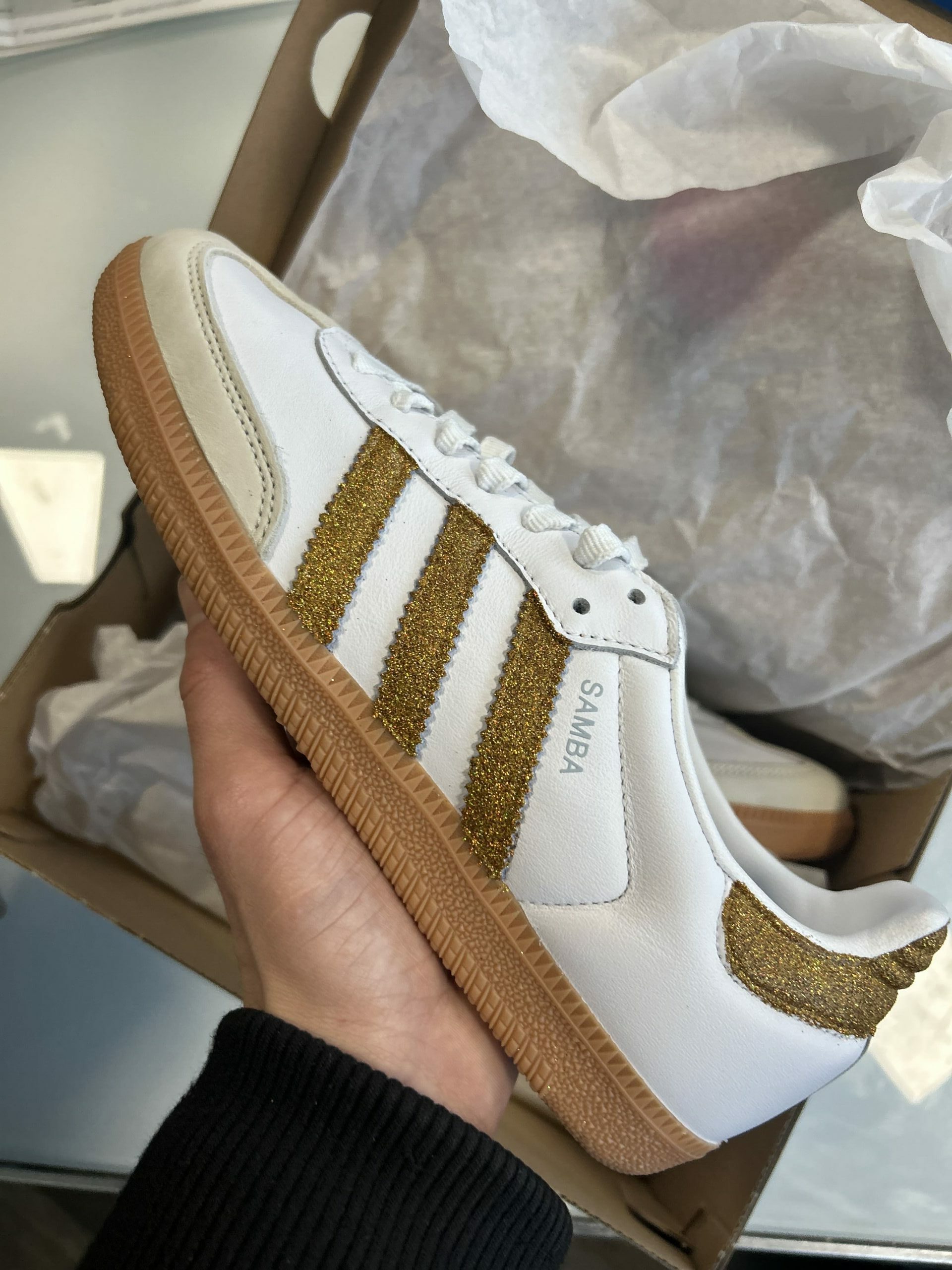 Adidas Samba – Paillette Bleue Découvrez notre Adidas Samba Glitter blue La paire a entièrement été customisée à la main par nos artistes LBS, dans notre atelier. Chaque paire est unique, nos customisations résistent à la pluie et aux craquèlements grâce à un vernis spécial. La prestation comprend la paire et la customisation.