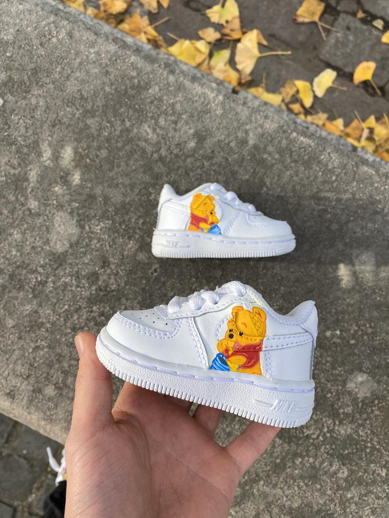 Cette Air Force One custom reprend le dessin animé Winnie l’ourson. Une customisation super mignonne pour les bébés, c’est le cadeau idéal pour une nouvelle naissance. La paire a entièrement été customisée à la main par nos artistes LBS, dans notre atelier. Chaque paire est unique, nos customisations résistent à la pluie et aux craquèlements grâce à un vernis spécial. La prestation comprend la paire et la customisation.