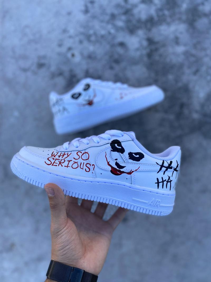 Cette paire de Air Force one reprend le célèbre film : JOKER ce qui lui donne un style unique ! Ce dégradé de couleur représente parfaitement l’univers et le décor du festival. La paire a entièrement été customisée à la main par nos artistes LBS, dans notre atelier. Chaque paire est unique, nos customisations résistent à la pluie et aux craquèlements grâce à un vernis spécial. La prestation comprend la paire et la customisation.