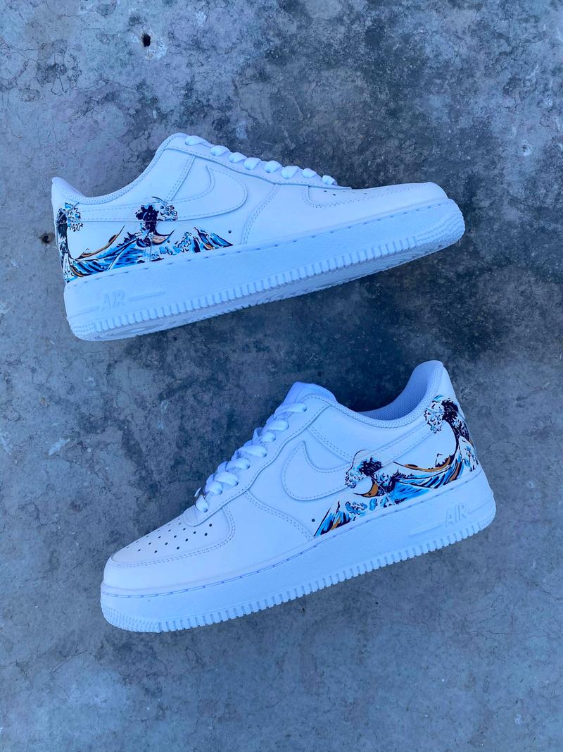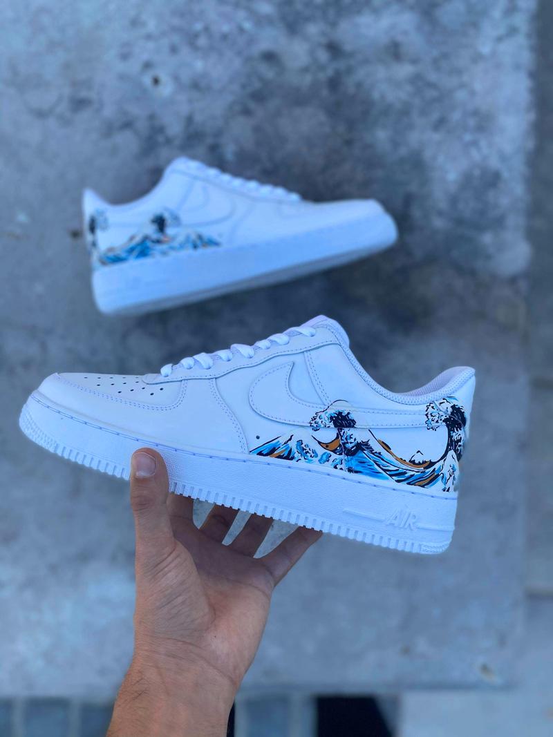 Cette paire de Air Force one s’inspire de la célèbre oeuvre » la grande vague Kanagawa » du Japonais Hokusai. La paire a entièrement été customisée à la main par nos artistes LBS, dans notre atelier. Chaque paire est unique, nos customisations résistent à la pluie et aux craquèlements grâce à un vernis spécial. La prestation comprend la paire et la customisation.