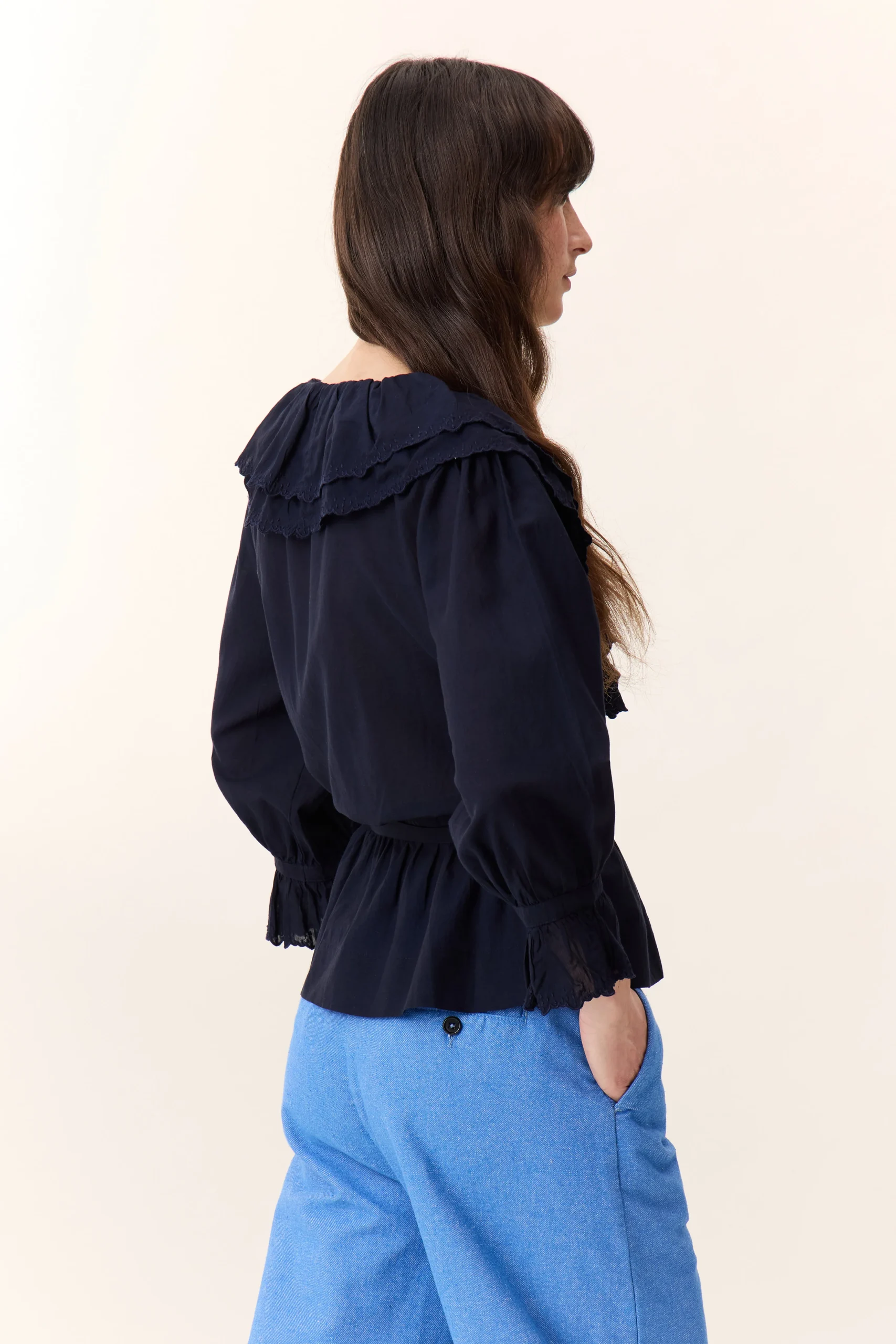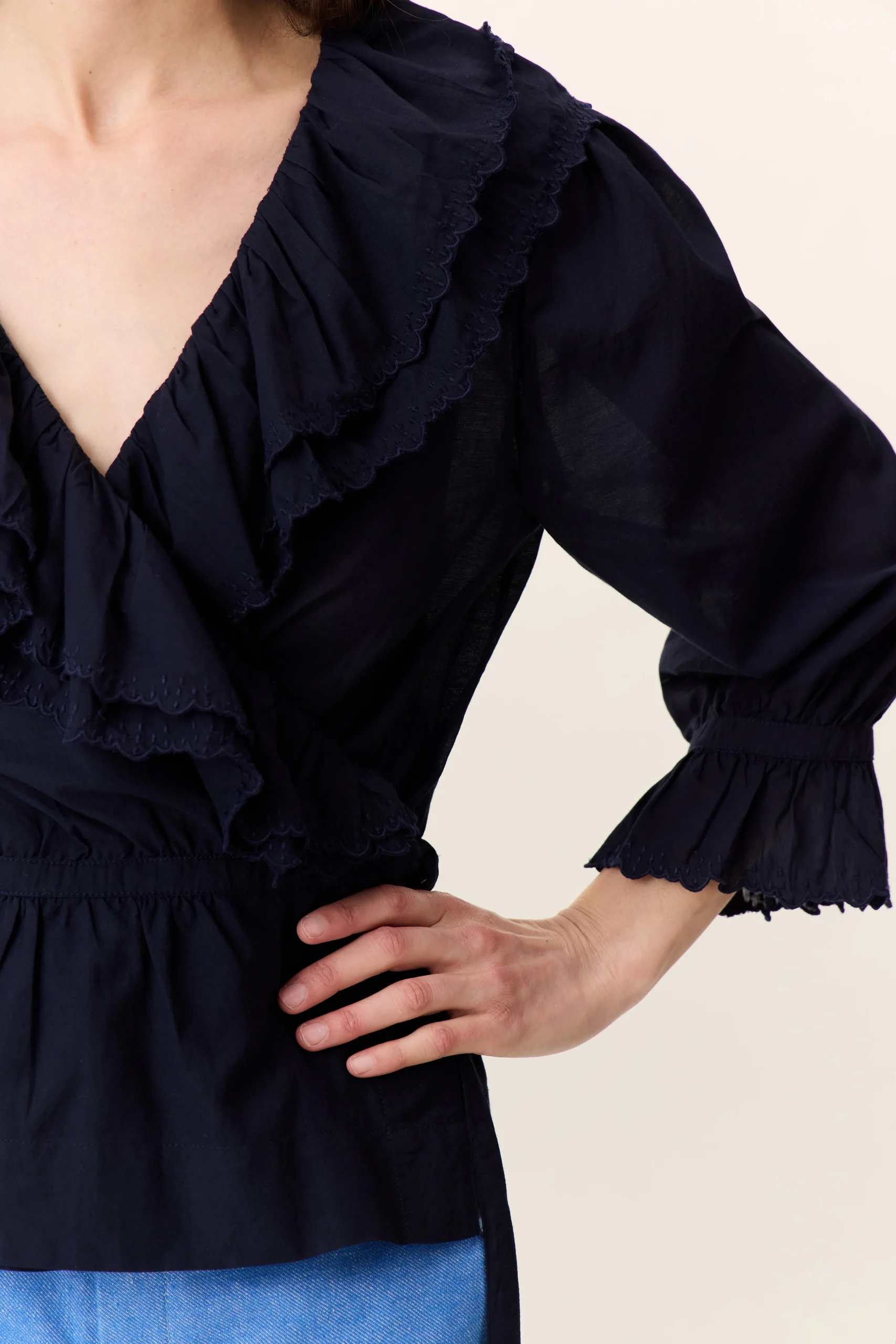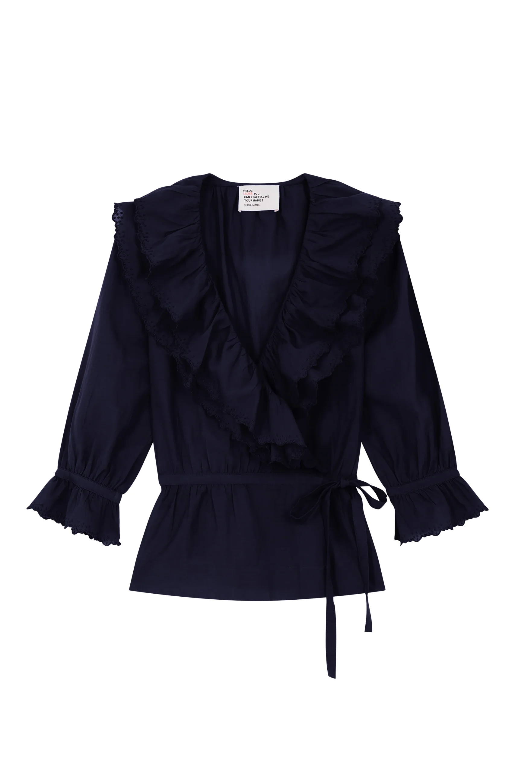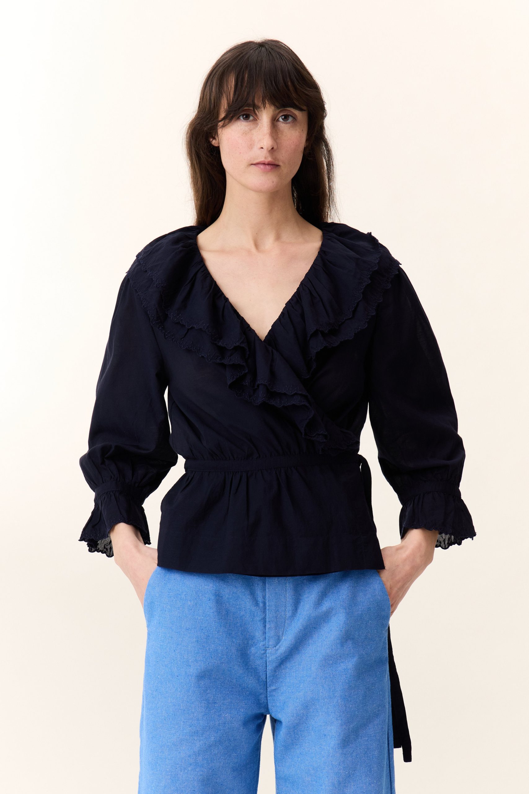 La blouse cache-cœur Cala Plain séduit par son charme romantique et ses détails délicats. Avec ses volants élégants et brodés qui habillent le décolleté, son tissu léger et sa ceinture, elle souligne la silhouette de la femme Leon & Harper et incarne la féminité !