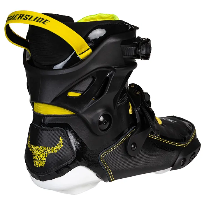 Le modèle TAU Bis, signé par Lorenzo Guslandi, l’un des meilleurs freestylers au monde, se distingue par son coque blanche peinte, son dessus noir, ses accents jaunes et son logo bison sur le talon. Un QR code intégré permet d’accéder à du contenu exclusif. Powerslide a retravaillé les détails internes pour améliorer le confort général.