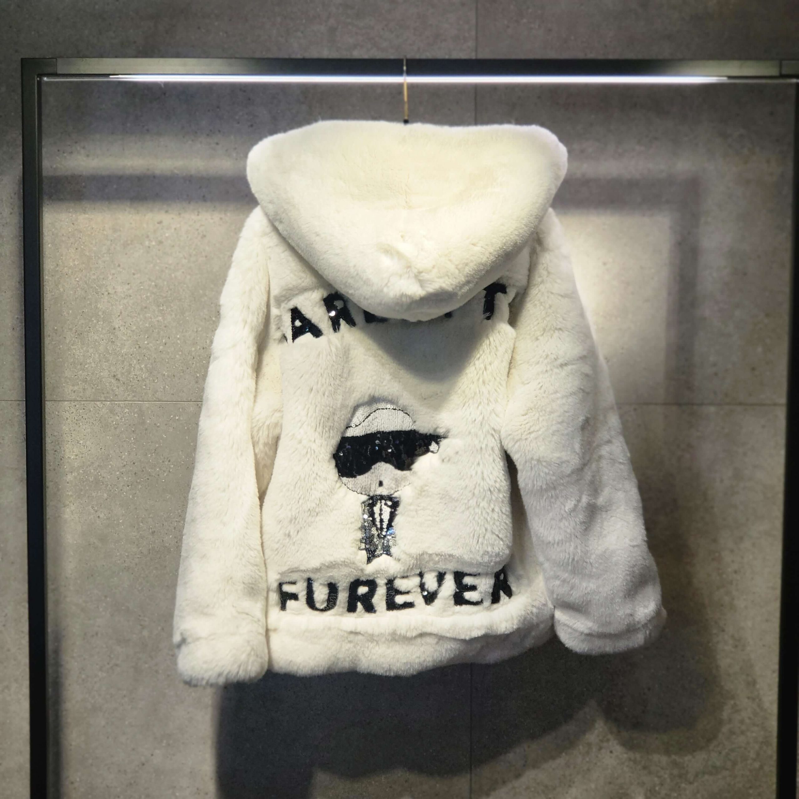 Veste à capuche en fausse fourrure blanche. Karletto furever brodée en paillettes et perles
