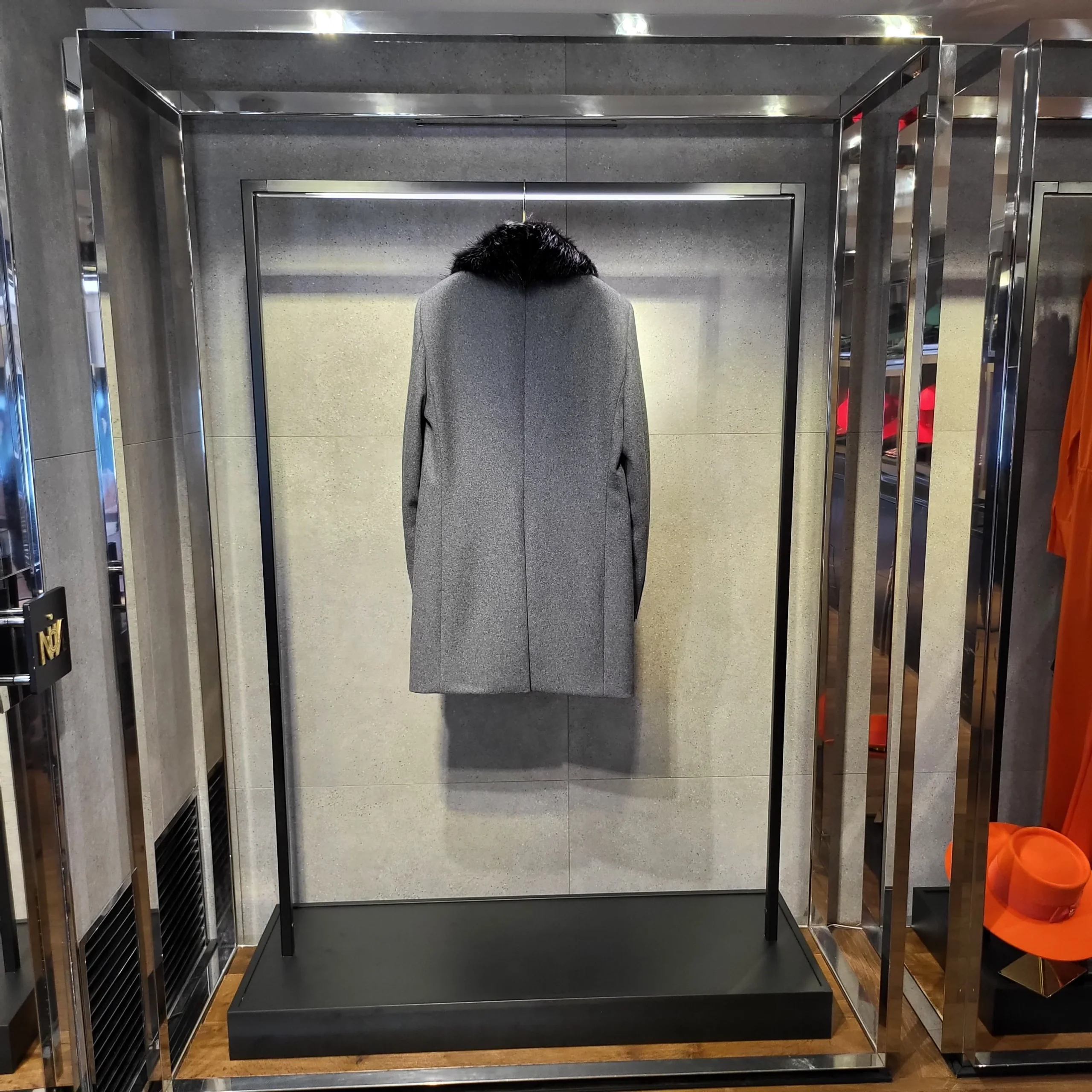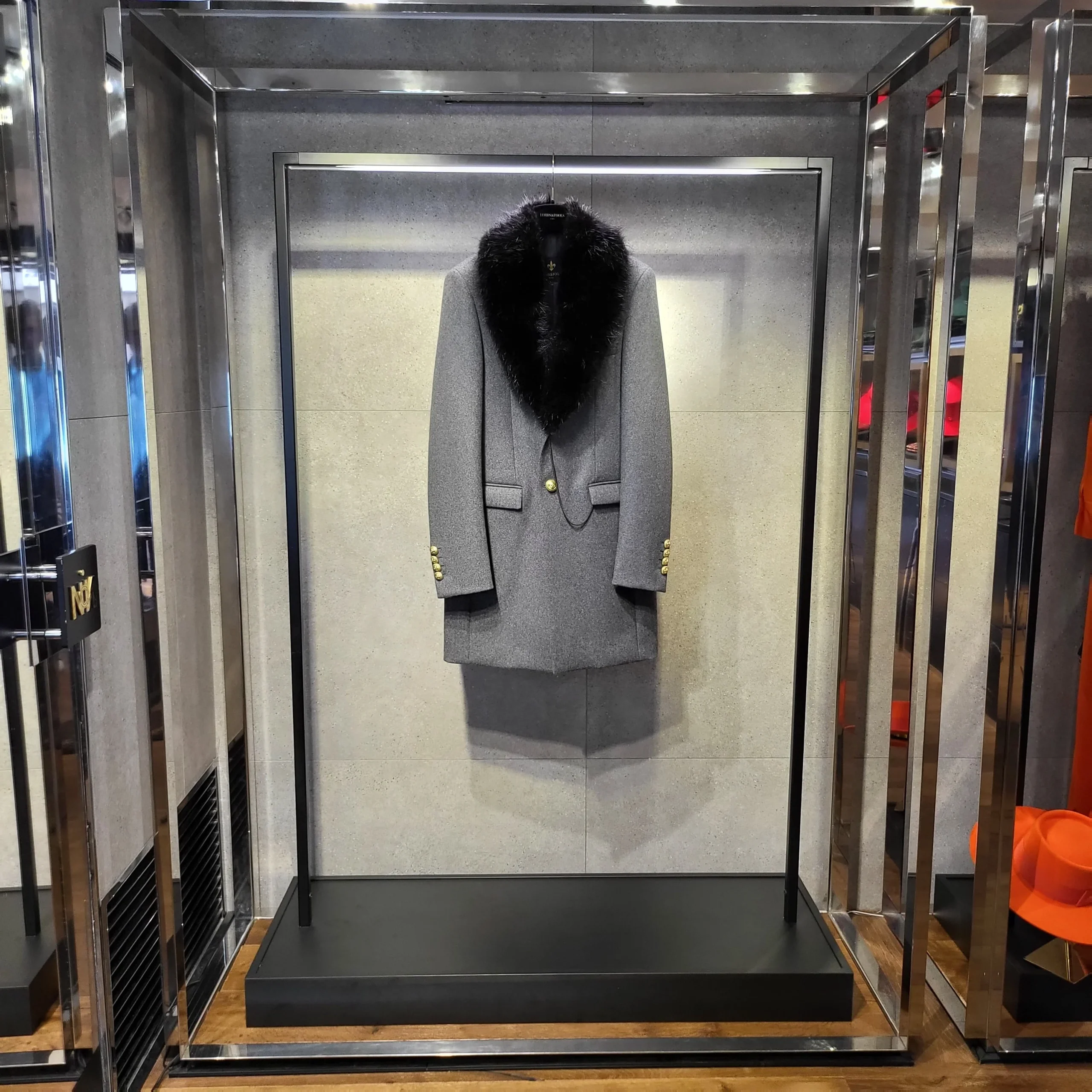 Manteau trois-quarts en drap de laine et cachemire gris orné de boutons dorés à fleur de Lys et d’une chaîne de poche, typique de la Maison. La pièce est sublimée par un col en fourrure de castor noir amovible. Le raffinement en toute simplicité.