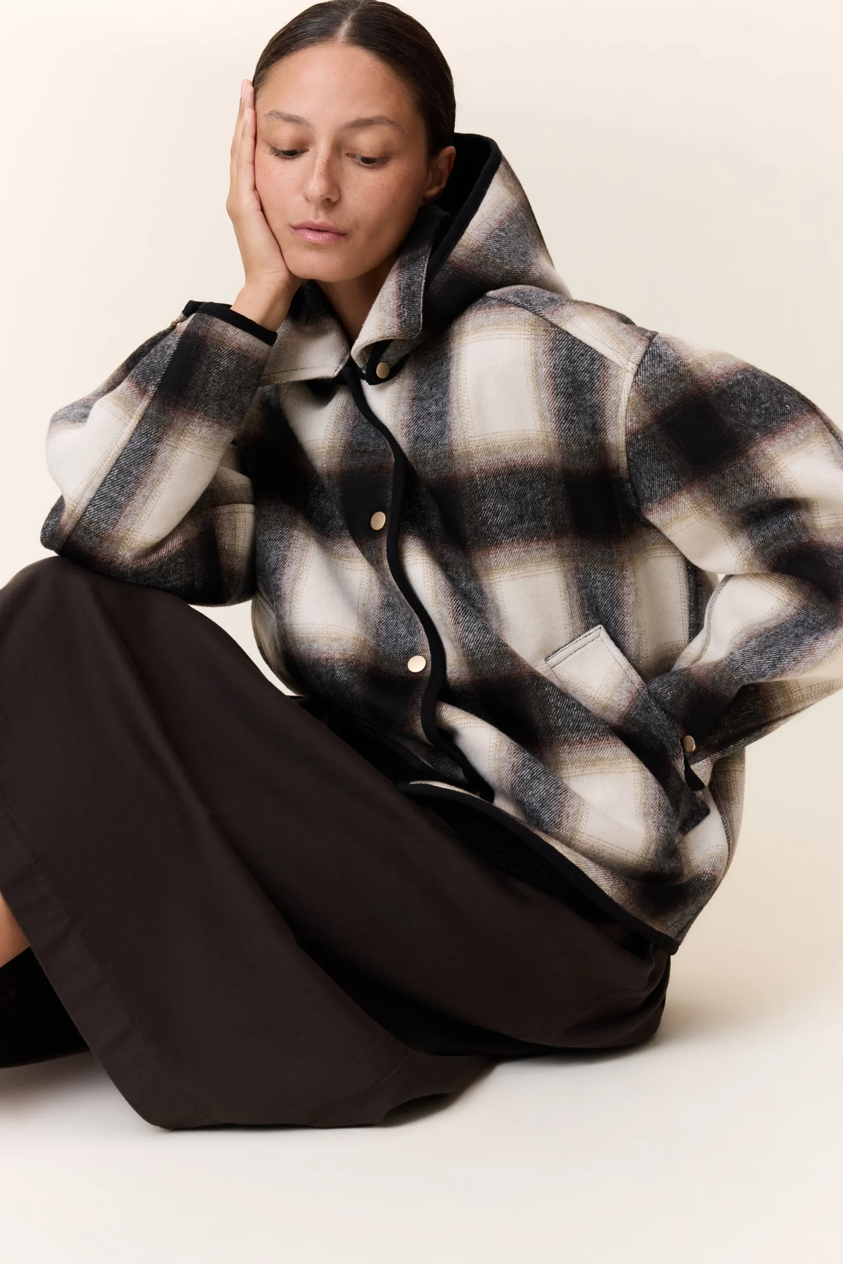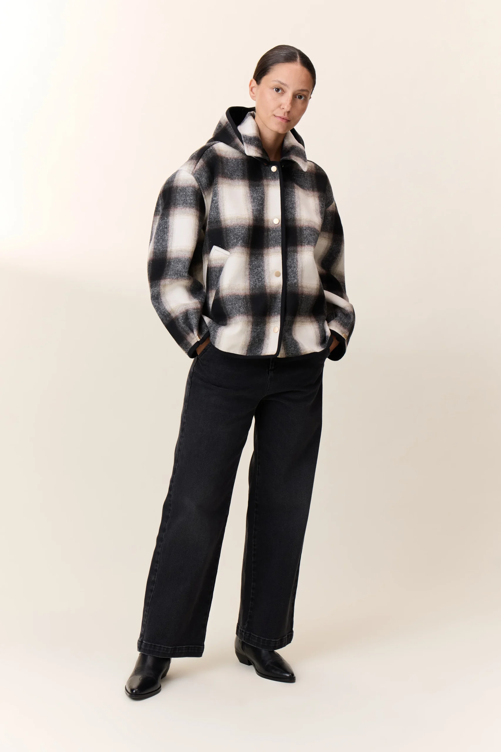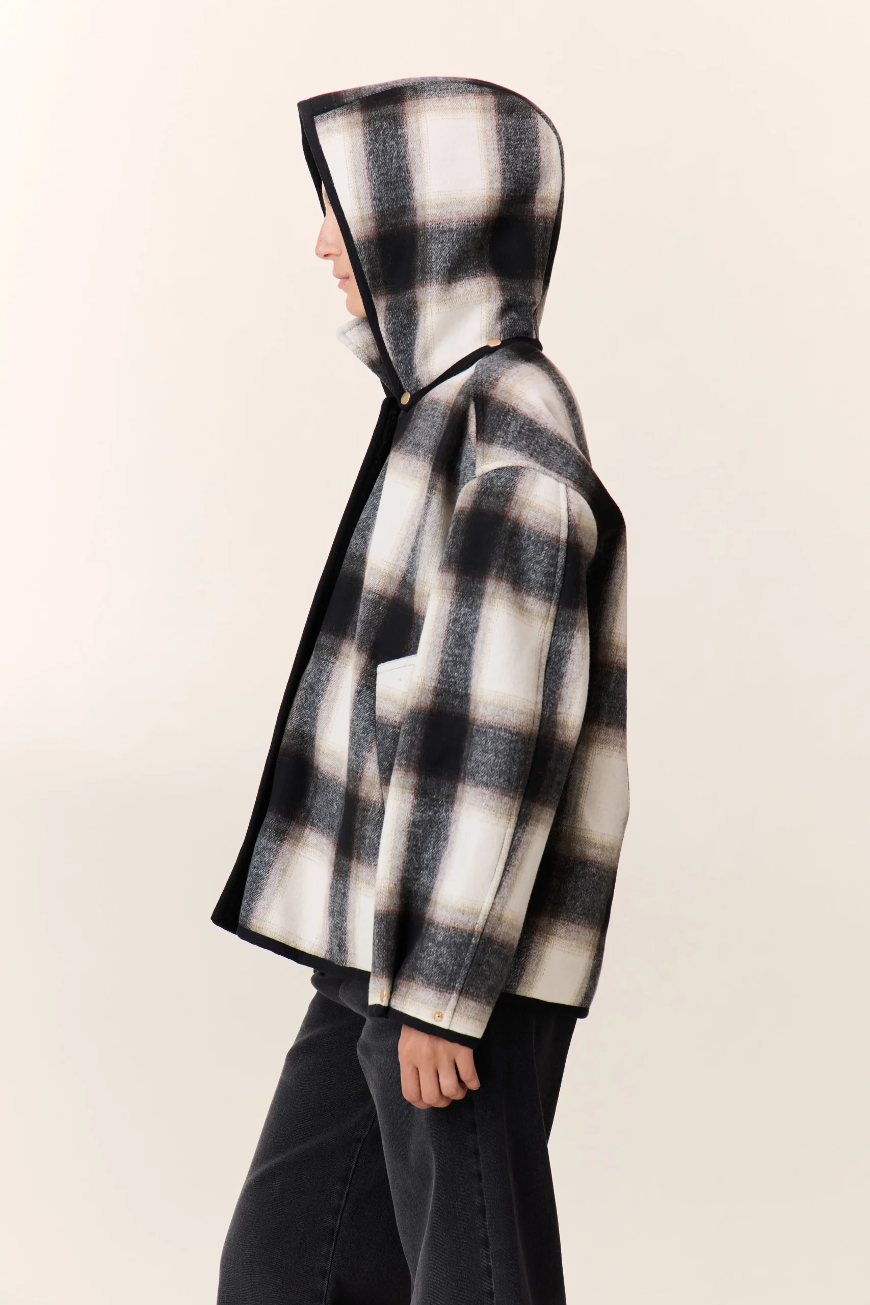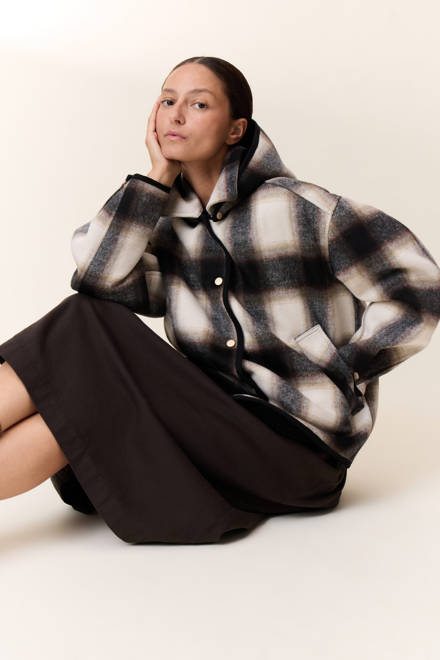Le manteau Vlad Crx incarne l’audace créative de Leon & Harper, avec une coupe courte et volumineuse qui structure la silhouette tout en offrant un confort moderne. Les carreaux, graphiques et assumés, apportent une signature visuelle résolument urbaine. Les finitions précises, comme les boutons métallisés et le liseré contrastant plaqué sur les contours, renforcent l’identité de la pièce. La capuche intégrée lui confère une dimension pratique et accentue son caractère polyvalent. À marier avec un pantalon droit ou une jupe longue.