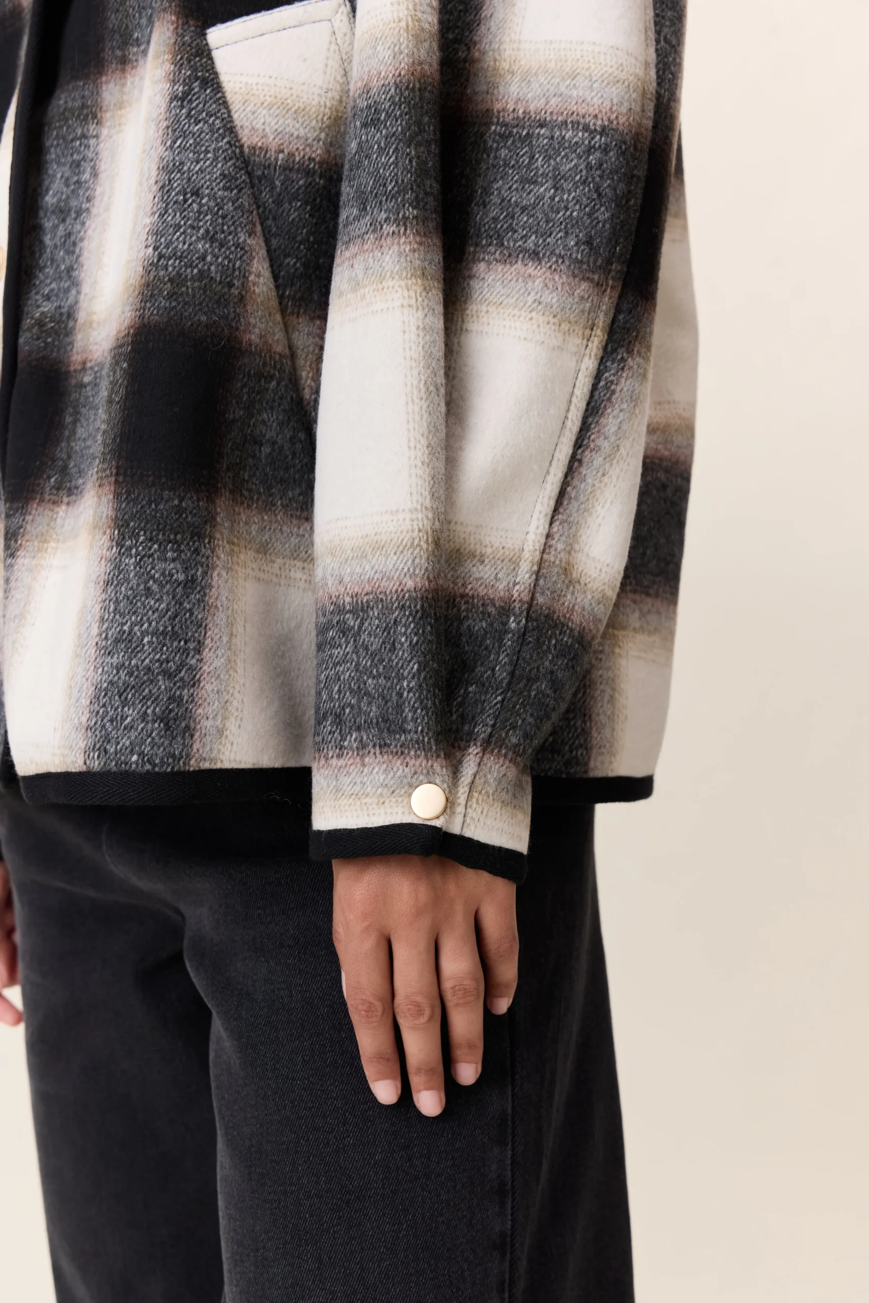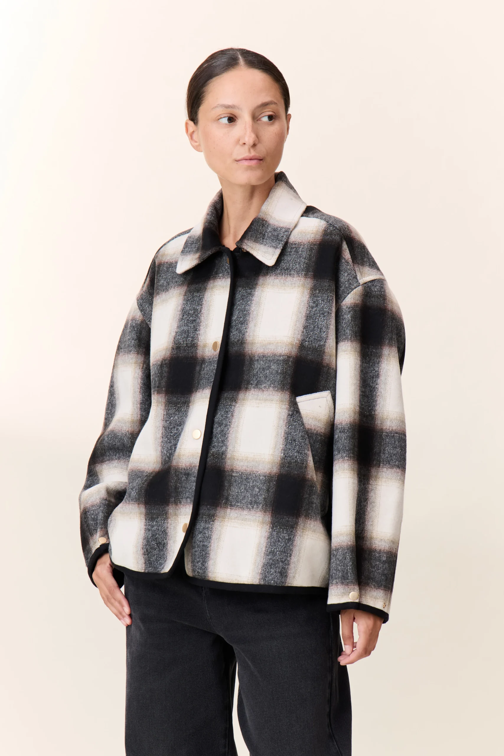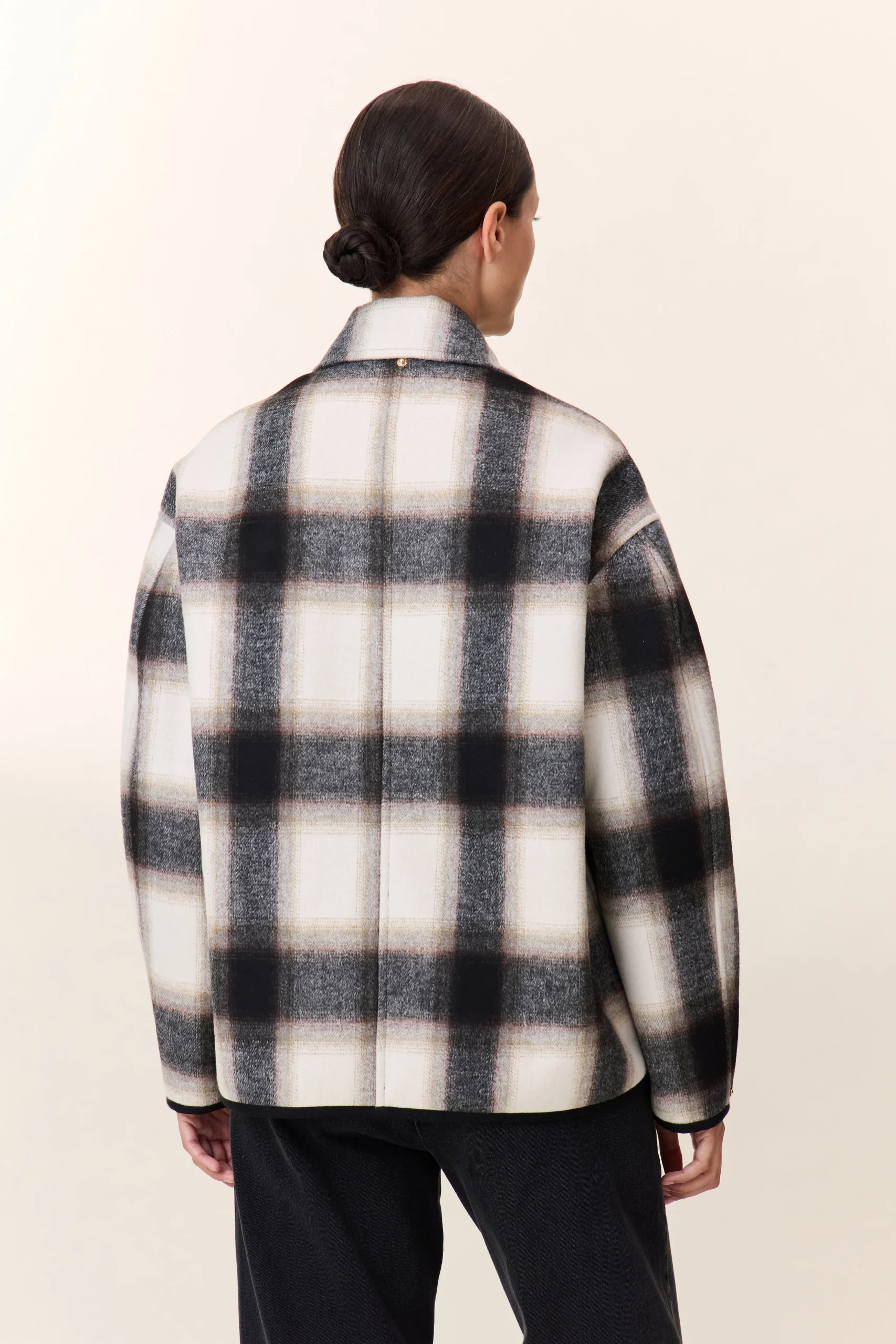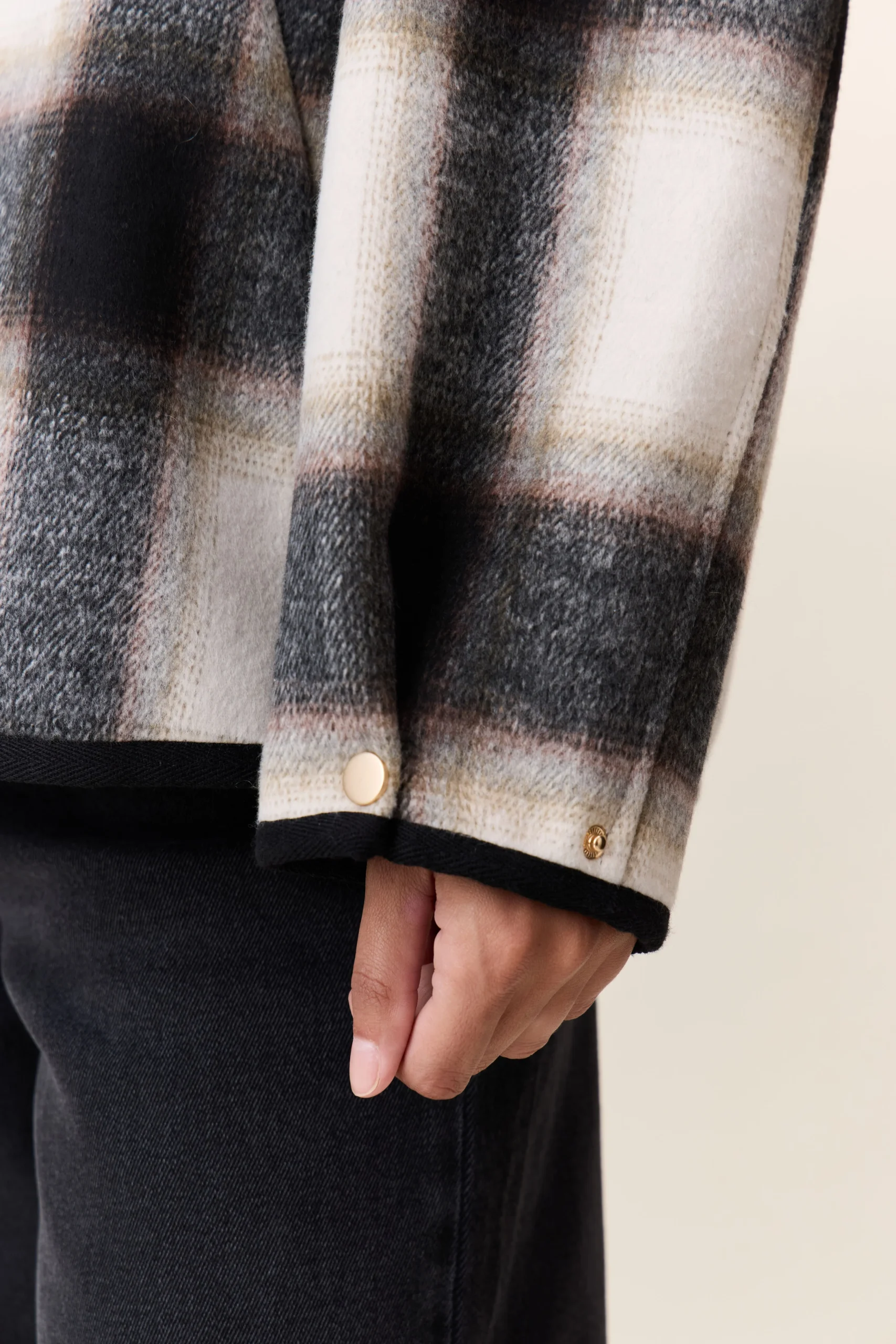 Le manteau Vlad Crx incarne l’audace créative de Leon & Harper, avec une coupe courte et volumineuse qui structure la silhouette tout en offrant un confort moderne. Les carreaux, graphiques et assumés, apportent une signature visuelle résolument urbaine. Les finitions précises, comme les boutons métallisés et le liseré contrastant plaqué sur les contours, renforcent l’identité de la pièce. La capuche intégrée lui confère une dimension pratique et accentue son caractère polyvalent. À marier avec un pantalon droit ou une jupe longue.