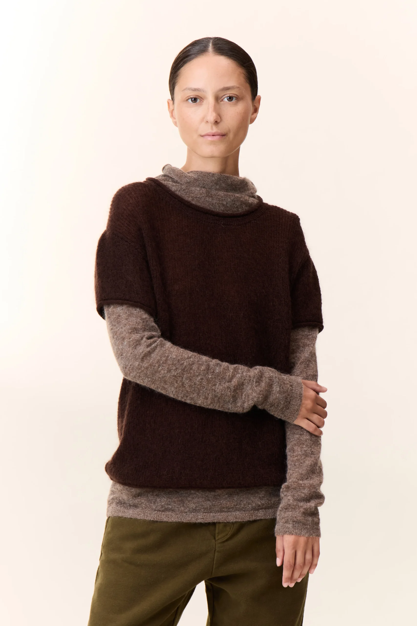 Le pull Mollie Dual par Leon & Harper explore la superposition avec une silhouette pensée pour la liberté de mouvement. Le jeu de superposition combine un pull extérieur ample à manches courtes et un col roulé à manches longues, offrant un contraste de volumes et une allure moderne. Sa maille, mélange de laine et de mohair, apporte légèreté et fluidité, tandis que les finitions précises témoignent du savoir-faire de la marque. Il se porte idéalement avec un pantalon près du corps ou un jean.