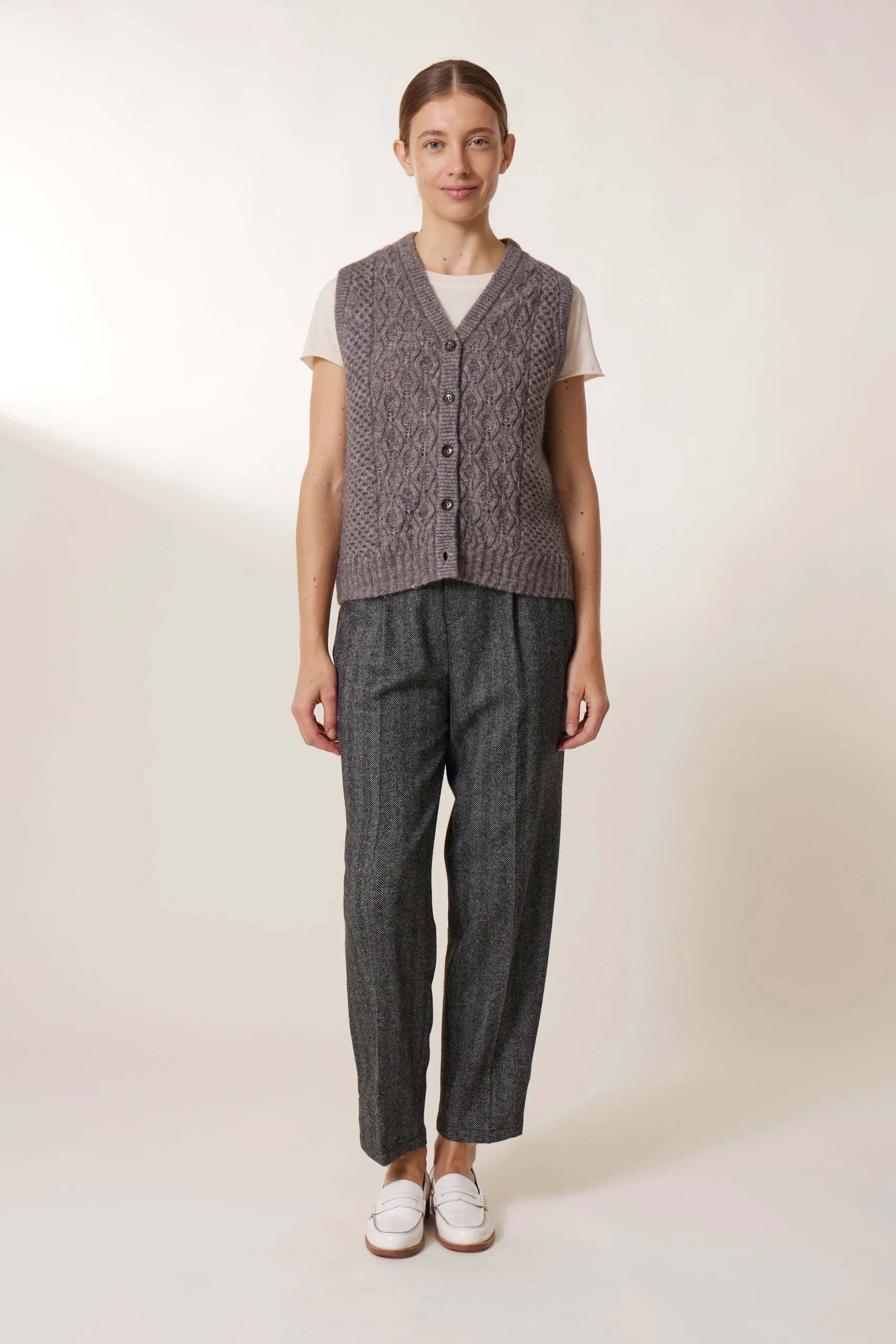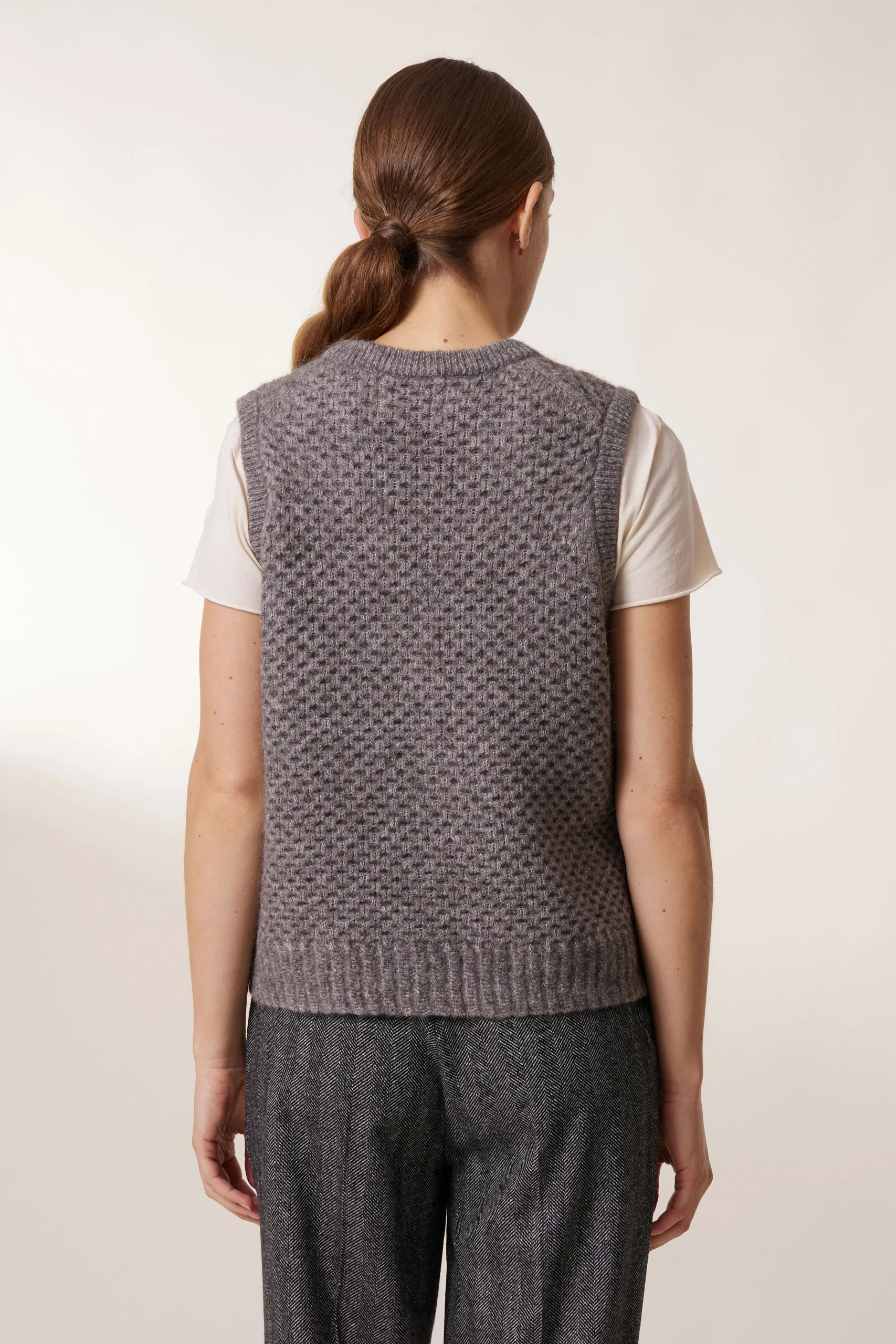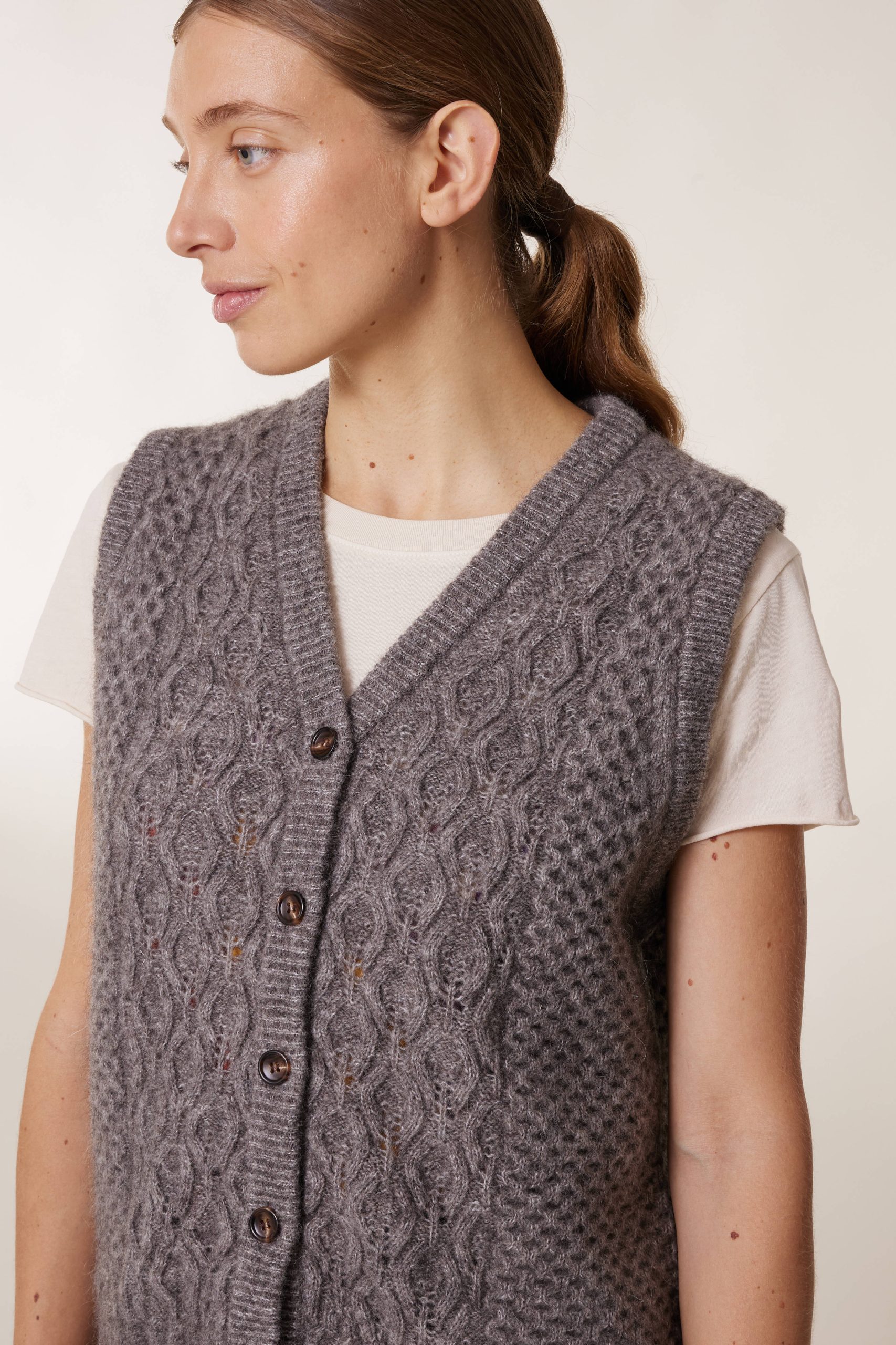 Les motifs torsadés du gilet sans manches Mood CHN assurent une allure traditionelle et authentique. La femme Leon & Harper le porte sur des t-shirts et des chemises pour rester bien au chaud cet hiver.