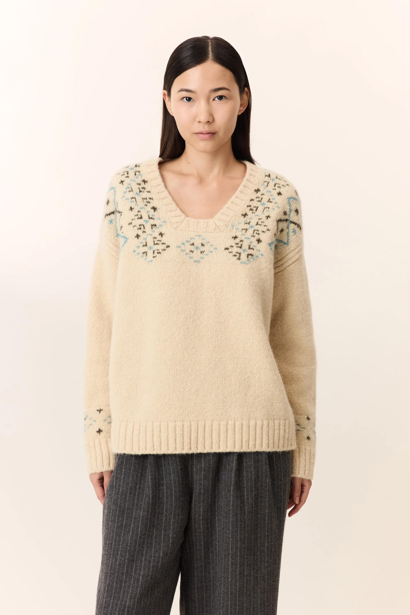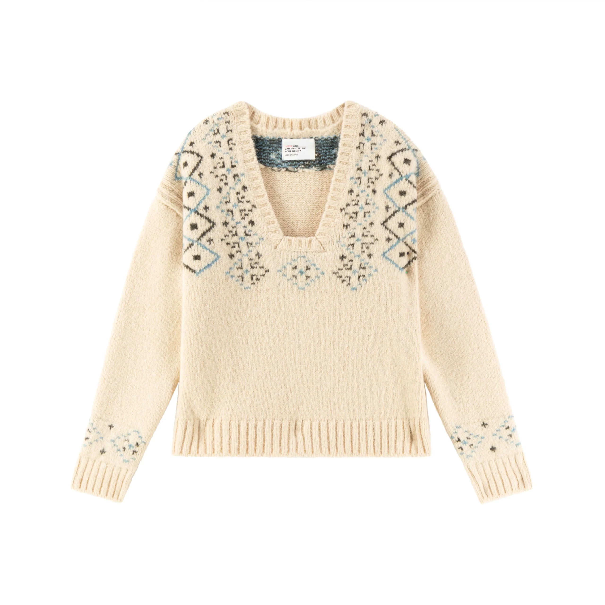 Le pull Mounty Jac revisite le jacquard avec un motif structuré sur le haut et les manches. Sa maille douce garantit un tombé souple, adapté aux journées fraîches. Le col V profond affirme une finition actuelle, tandis que les finitions côtelées aux poignets et à la base renforcent la tenue de la silhouette. À porter avec un jean brut ou un pantalon large pour une allure décontractée et authentique.