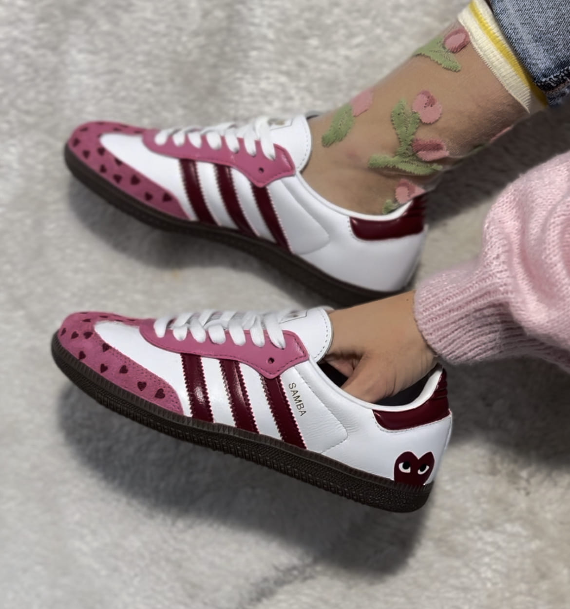 Adidas Samba – CDG La paire idéale pour les fêtes de fin d’année ! La paire a entièrement été customisée à la main par nos artistes LBS, dans notre atelier. Chaque paire est unique, nos customisations résistent à la pluie et aux craquèlements grâce à un vernis spécial. La prestation comprend la paire et la customisation.