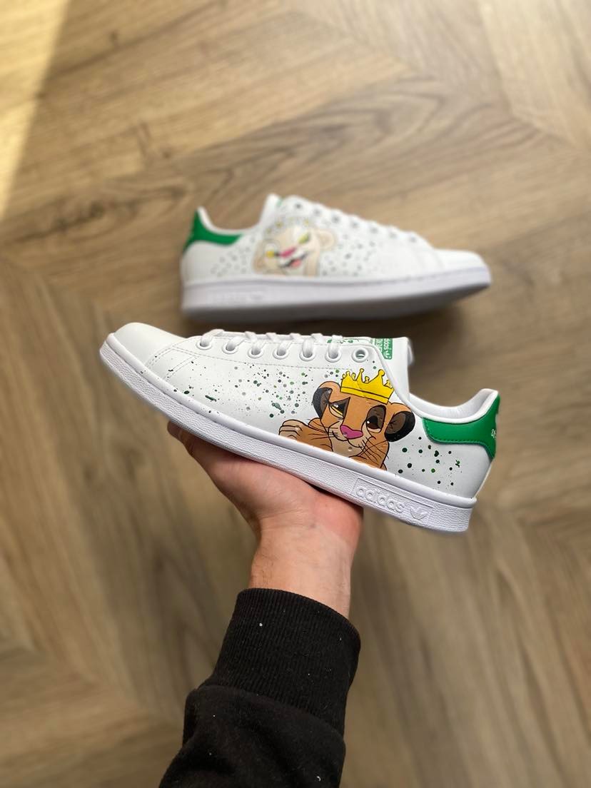 Découvrez cette Stan Smith – Roi Lion avec les personnages Nala & Simba La paire a entièrement été customisée à la main par nos artistes LBS, dans notre atelier. Chaque paire est unique, nos customisations résistent à la pluie et aux craquèlements grâce à un vernis spécial. La prestation comprend la paire et la customisation.