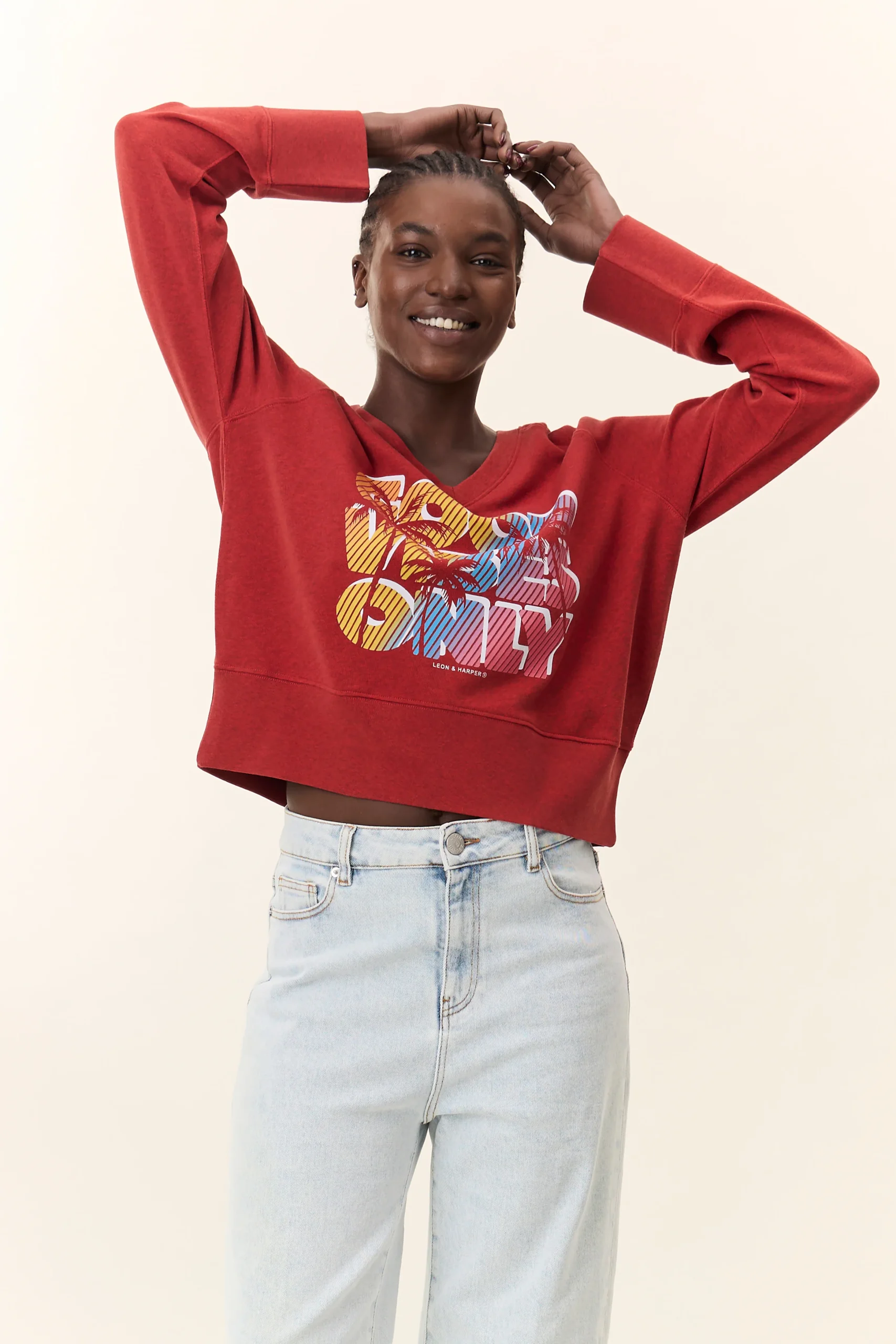 Le sweat Shavi Only est une pièce casual et vibrante, idéale pour un look décontracté. Son inscription «  »Good Vibes Only » », accompagnée de palmiers lui confèrent une ambiance estivale et positive. La femme Leon & Harper l’associe avec un jean ou une jupe pour look casual chic empreint de bonne humeur et d’énergie positive.