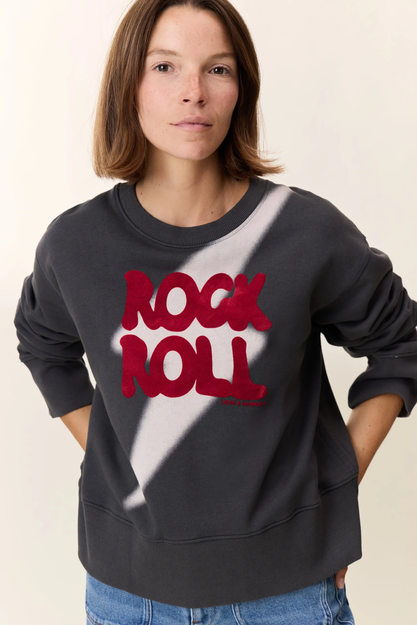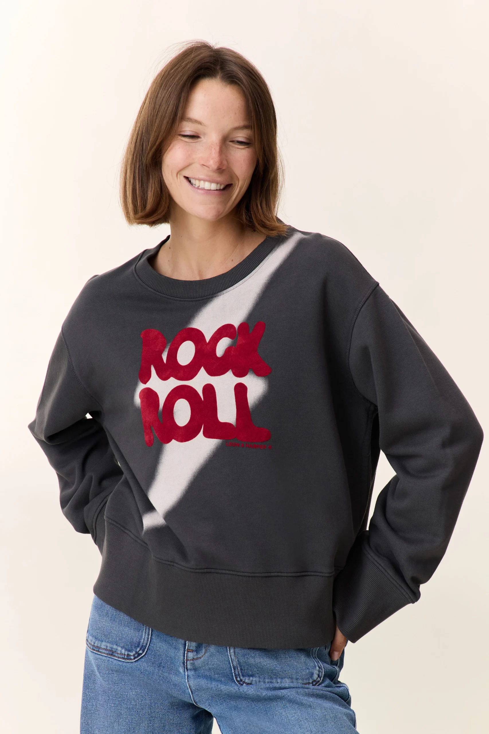 Le sweat Sorbet Rock revisite l’esprit Leon & Harper avec un imprimé « ROCK ROLL » accompagné d’un éclair, signature d’une touche pop assumée. Sa coupe droite et ses manches longues procurent un tombé structuré sans sacrifier le confort. Les bords-côtes aux poignets et à la base dessinent la silhouette, tandis que le col rond souligne l’allure moderne. À porter avec un jean ou un pantalon large pour affirmer un style du quotidien.