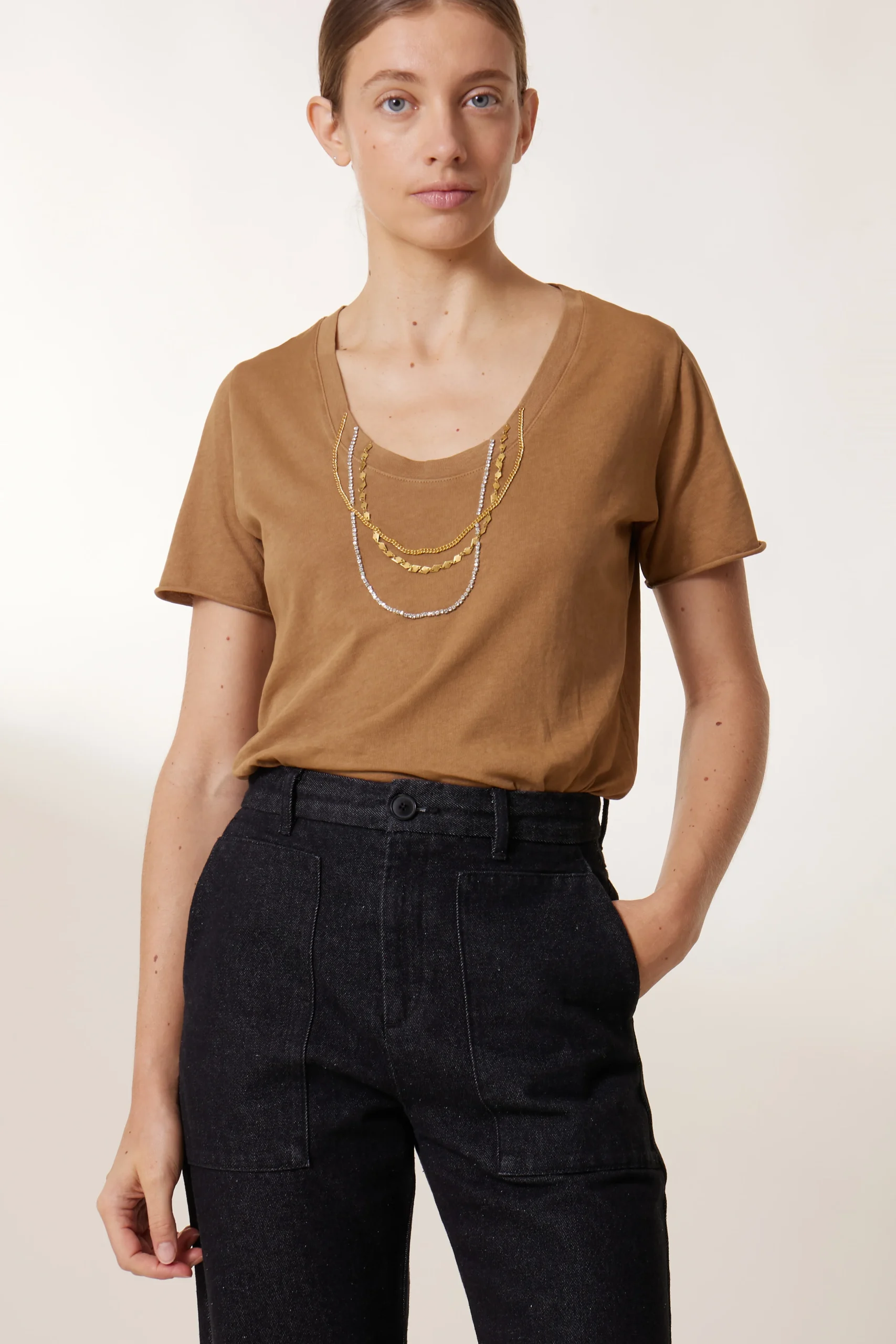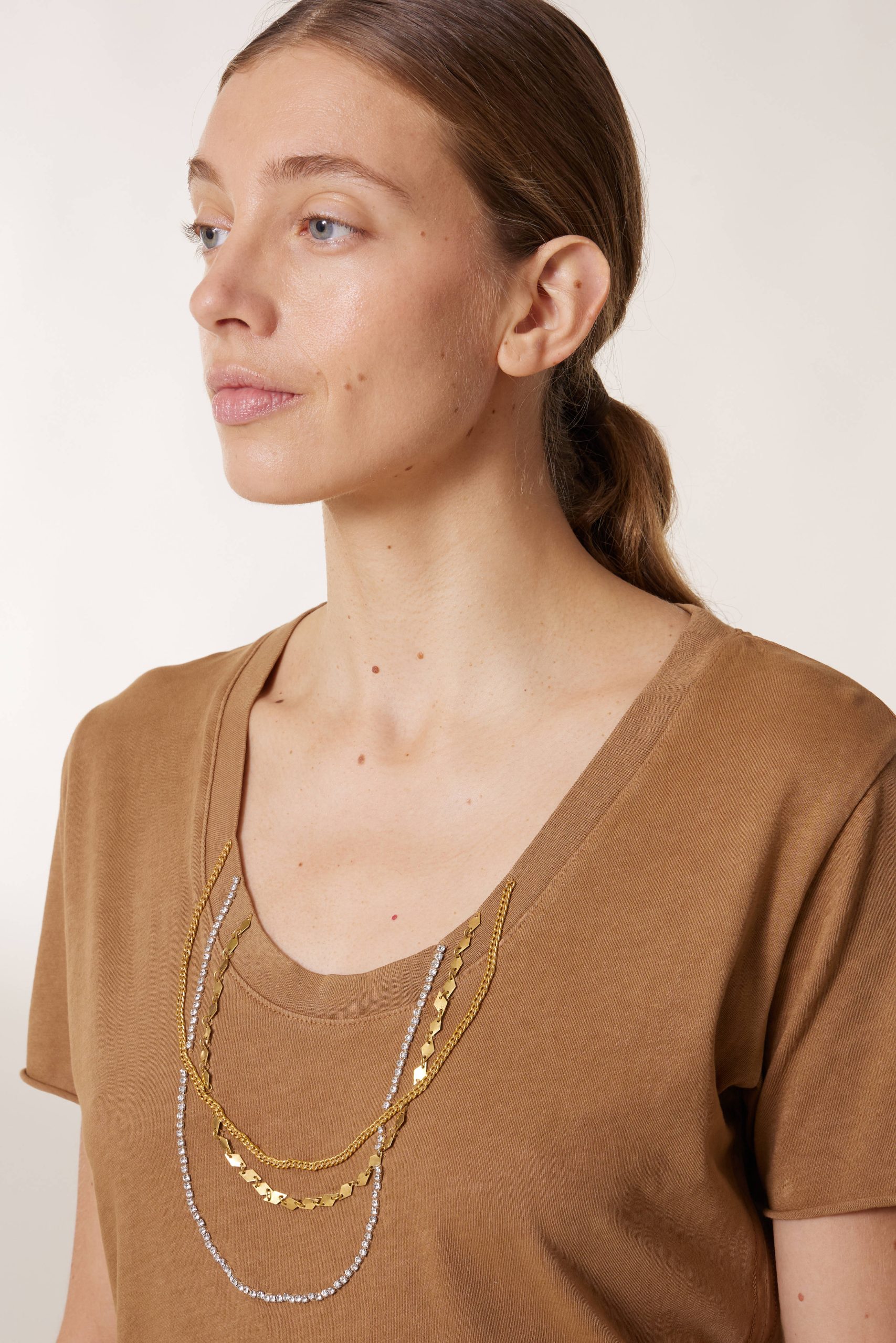 Avec ses strass brodés au décolleté qui forme une supperpostion de colliers, le t-shirt Tizia Diamond est la touche d’éclat des tenues d’hiver de la femme Leon & Harper.