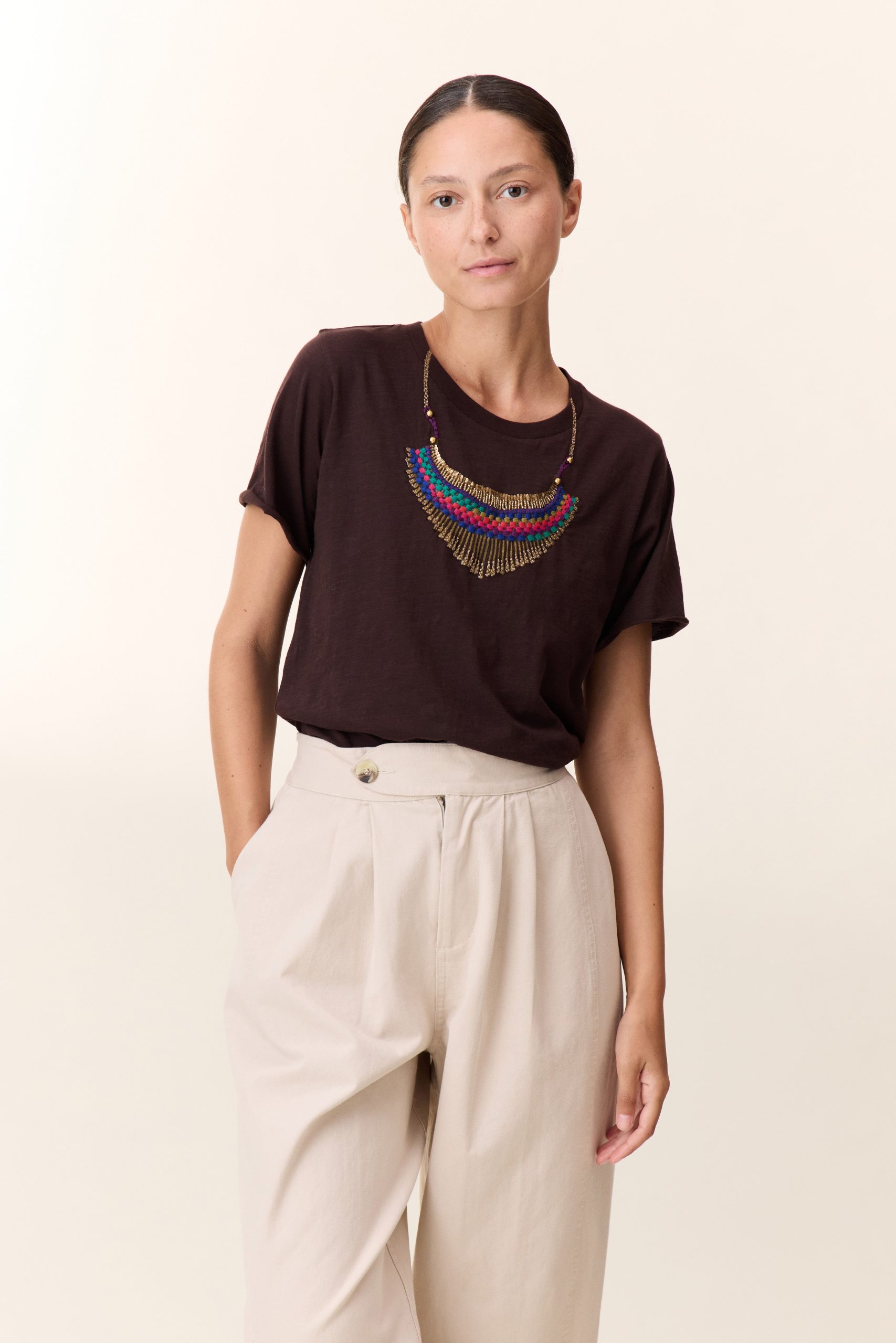 Le t-shirt Toro Collier s’impose comme un essentiel revisité. Composé en 100% coton organique , il mise sur une maille douce au tombé naturel, pensée pour la liberté au quotidien. Le col rond révèle un motif appliqué qui rappelle un collier, souligné par des détails texturés et une finition nette. Portez-le aussi bien avec un jean pour une démarche cool qu’avec une veste pour un look plus affirmé.